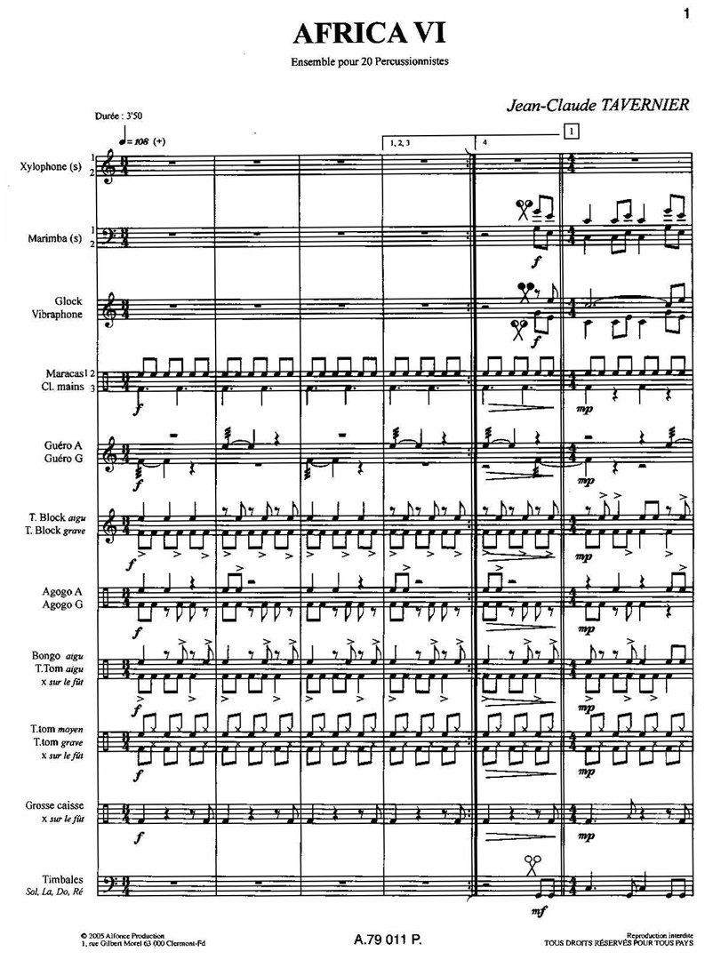 Ensemble pour 20 percussionnistes : Xylos, marimbas, glock, vibra, maracas ou hochet, fouet, guiero, tple block, cloche a vache, bongo, tom tom, grosse caisse, 4 timbales – Duree : 3min 50 sec –