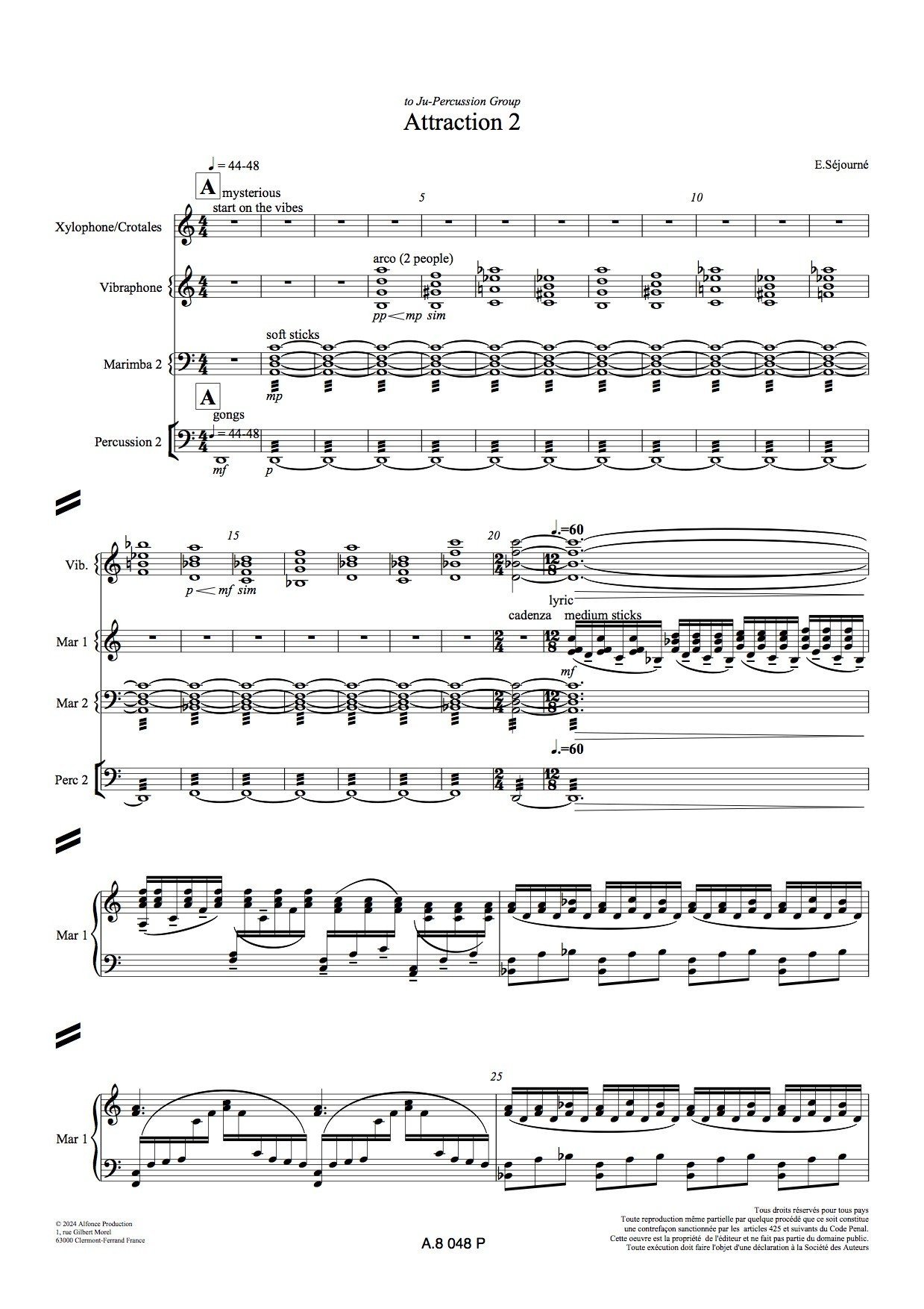 Arrangement de la pièce originale ATTRACTION pour 7 percussionnistes :Marimba X 2 – Vibra – Xylo – percussions X 3