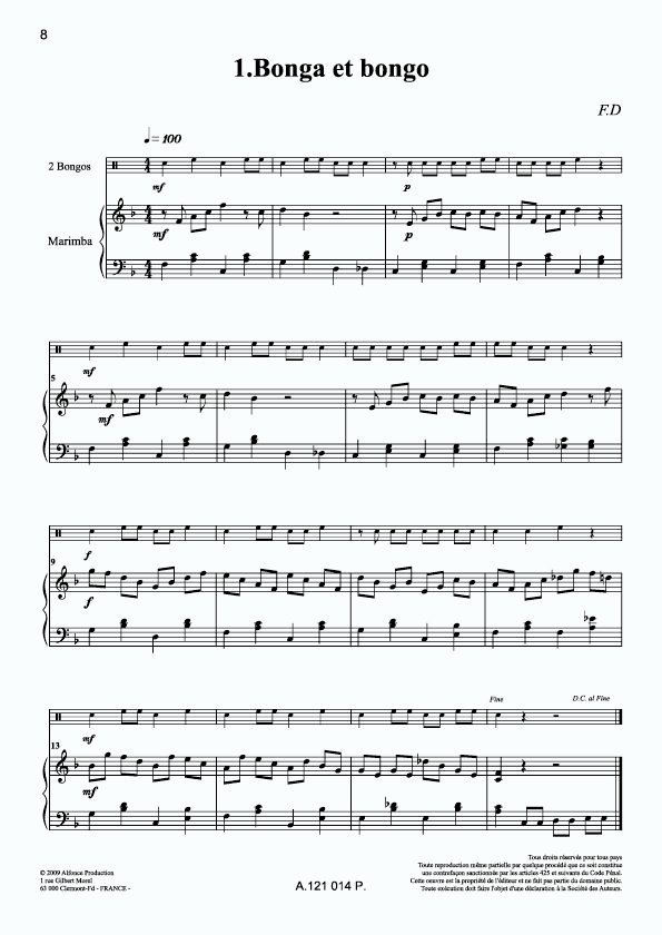 Recueil de 14 duos inspir par la musique brilienne Bonga et Bongo aborde le travail des multi- percussions. De difficultes progressives, ces duos doivent re abord dans un esprit de musique de chambre. Le CD permet l’e de travailler la mise en place et le phrase rythmique gre des accompagnements de percussions bresiliennes qui l’impregnent du groove tout en remplacant agreablement le metronome. Les parties de marimba font l’objet d un second cahier destine aux eleves d’un niveau plus avance.