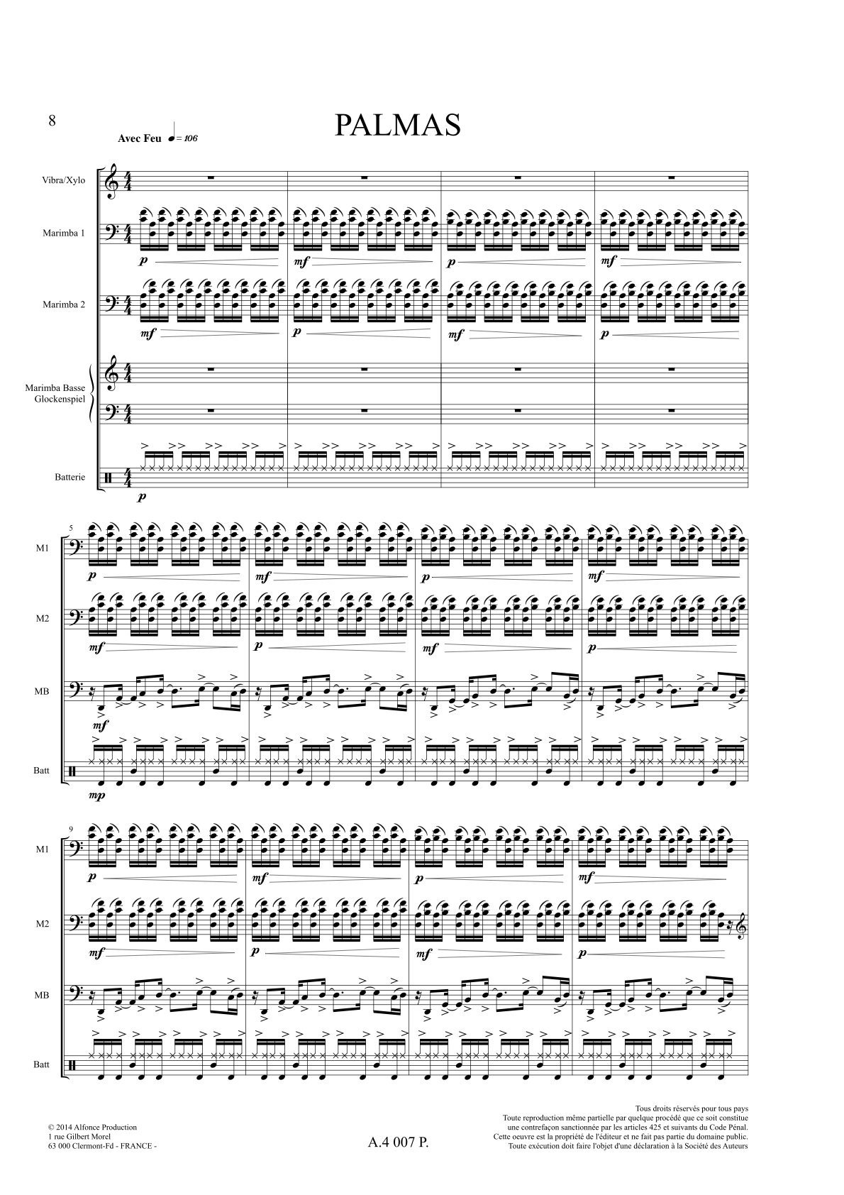Pour vibra / xylo, 2 x marimbas, marimba basse / glock, batterie