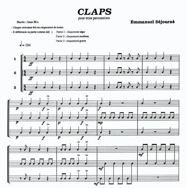 Pièce pour 3 percussionnistes qui feront des claquements de doigts – 1 min 30 sec – Anciennement éditée par les éditions Zurfluh