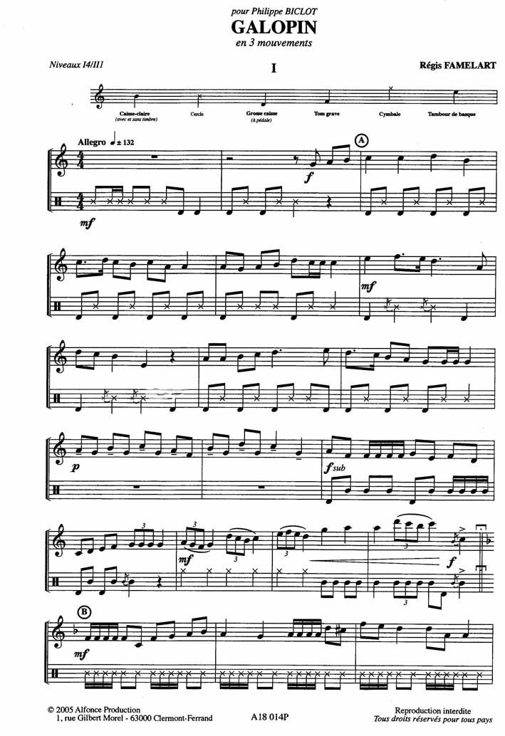Petit concerto en 3 mouvements : I Mvt / voix 1 : xylo ou marimba – voix 2 : batterie II Mvt / solo de multi-percussions III Mvt / voix 1 : 3 timbales, voix 2 : batterie