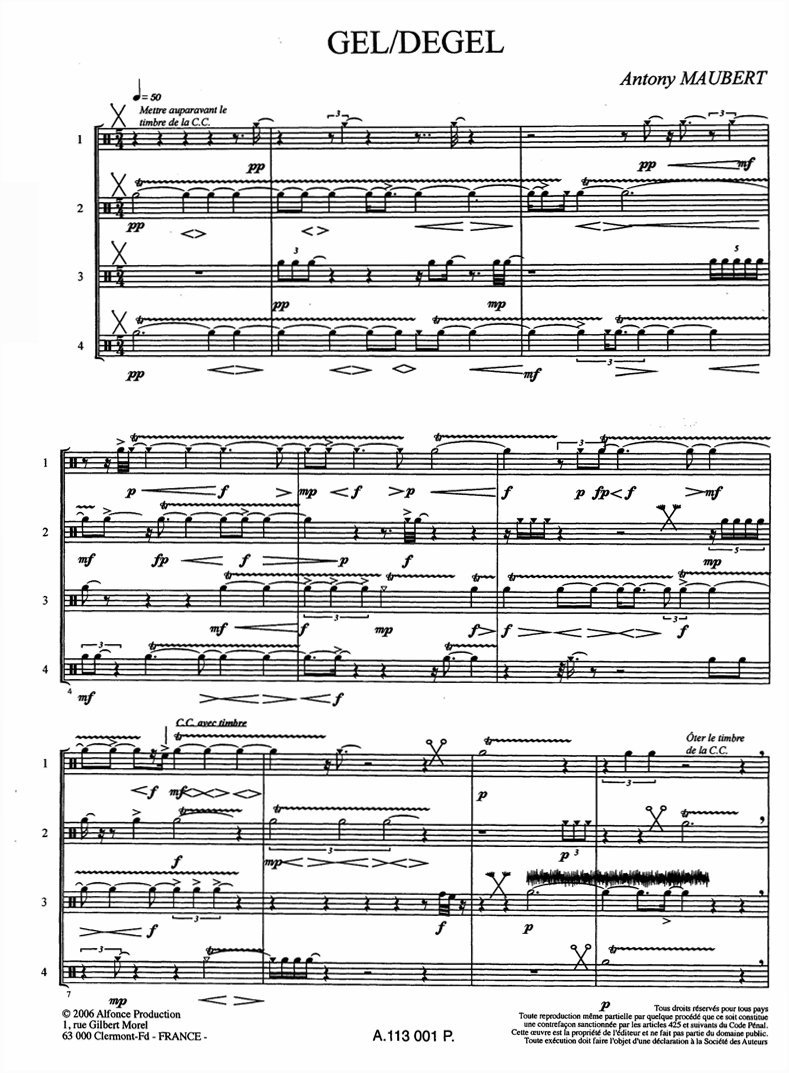 Gel/Degel s’appui sur deux principes de modification de l’etat de l’eau. L’etat solide et l’etat liquide creent une dialectique entre la rigidité et la fluidité, l’ordre et le chaos. La partition s’articule donc autour de ces poles pour creer les textures, les rythmes et la structure de l’ensemble : Timbales medium grave, grave, medium aigue et aigue, tom, caisse claire, cymbales grave, aigue et medium, rim shot, dead stroke, tom medium aigu medium grave, grave et aigu, triangle congas,