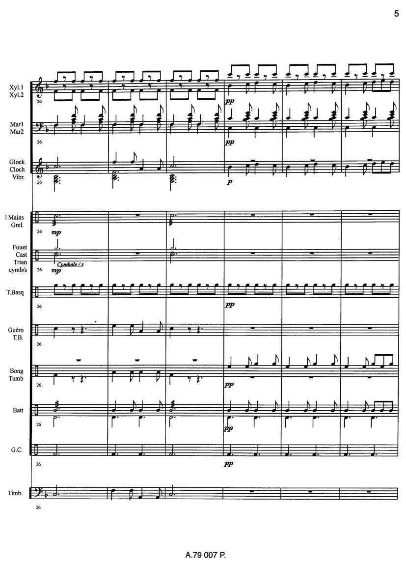 Xylo, marimba, glock, cloches, vibra, grelots, castagnettes, fouet, triangle, cym susp, tamb de basque, gueiro, tpl block, bongos, tumbas, batterie, grosse caisse, 4 timbales