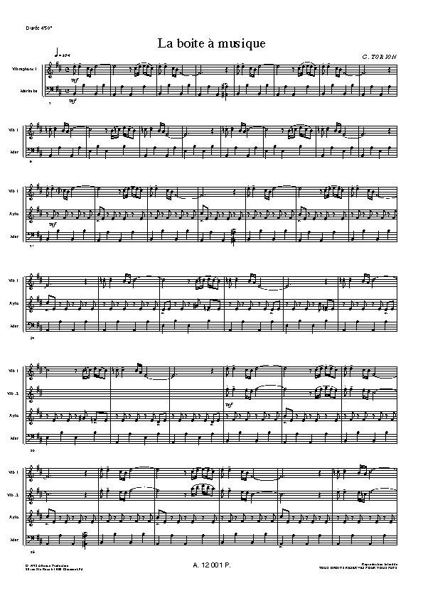 piece pour 2 vibraphones, xylophone, marimba, timbales, grosse caisse, caisse claire, cymbale.