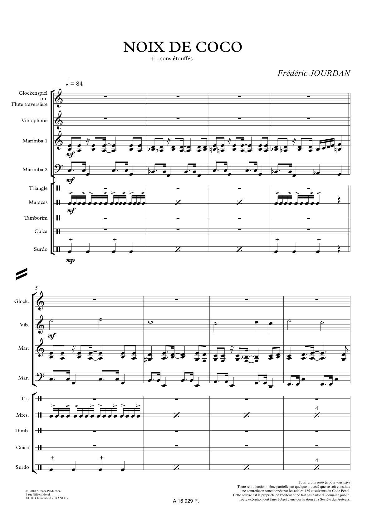 Noix de coco, pour 9 musiciens : Glock (et/ou flute traversière) – Vibra – Marimba (2 musiciens sur le meme instrument) – Triangle – Maracas – Tamborim – Cuica – Surdo