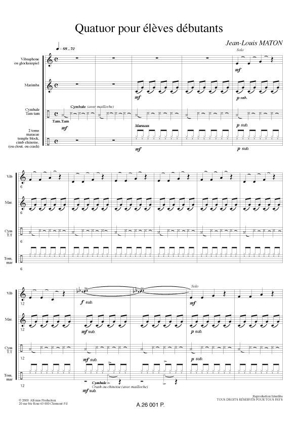 Un quatuor vraiment tres simple pour les debutants. Pour 2 claviers et 2 percussions : vibra ou glock – marimba – cymbale – tam tam – toms – maracas – temple blocks – (2 keyboards and 2 percussions)