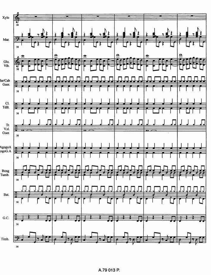 Xylo, marimba, glock, vibra, maracas, guero, cabacca, claves, tamb de basque, triangle, vibra slap, guero g, cloches a vaches, bongos, tumbas, batterie (drums), grosse caisse, 4 timbales