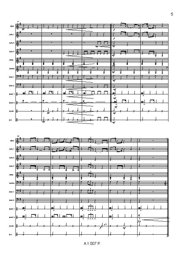Piece pour glockenspiel, 3 xylophones, vibraphone, marimba, timbales, caisse claire, 2 tambours, cymbales, grosse caisse.