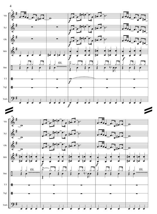 Arrangement du celebre theme de James Bond pour 8 percussions : Vibra, xylo, glock, marimba, batterie, tam tam, triangle, timbales