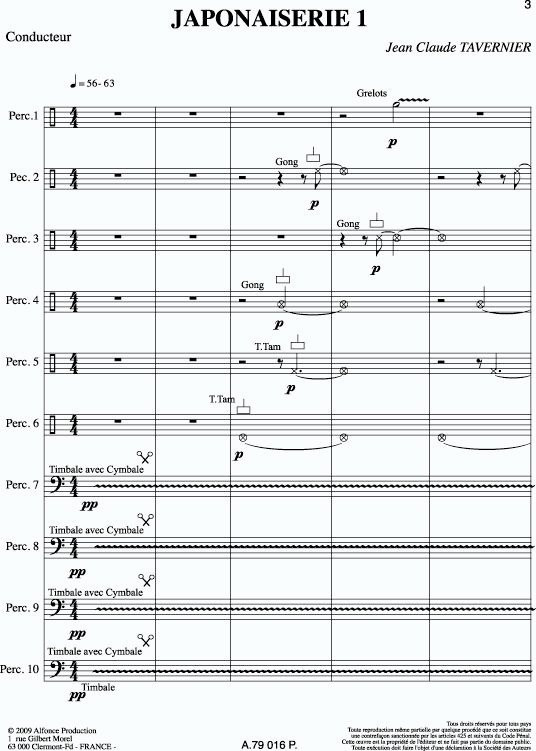 - Grelots, gong moyen, tamb aigu x 6, tamb grave x 7, gong grave x 2, tam tam moyen, tam tam grave, timbales x 4