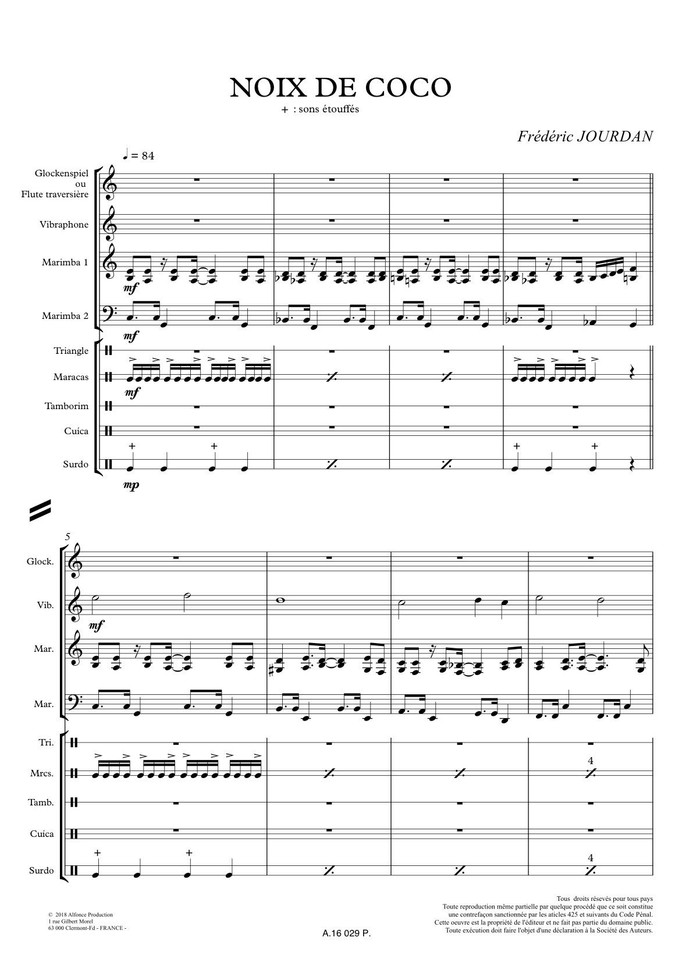 Noix de coco, pour 9 musiciens : Glock (et/ou flute traversière) - Vibra - Marimba (2 musiciens sur le meme instrument) - Triangle - Maracas - Tamborim - Cuica - Surdo